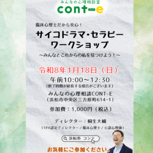臨床心理士によるサイコドラマセラピー・ワークショップ~みんなとこれからの私を見つけよう~日時:令和8年1月18日、日曜日、am10時~12時30分(延長する場合… 続きを読む