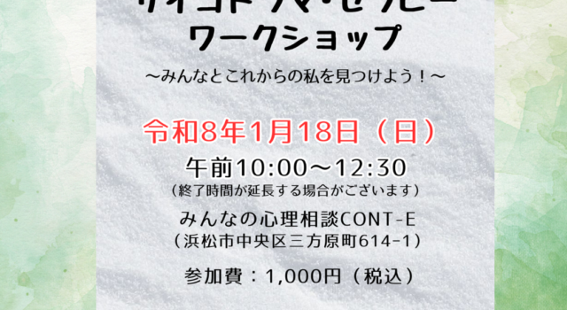 臨床心理士によるサイコドラマセラピー・ワークショップ~みんなとこれからの私を見つけよう~ 日時:令和 … 続きを読む 令和8年1月18日(日)サイコドラマ・セラピー・ワークショップ 参加者募集中!